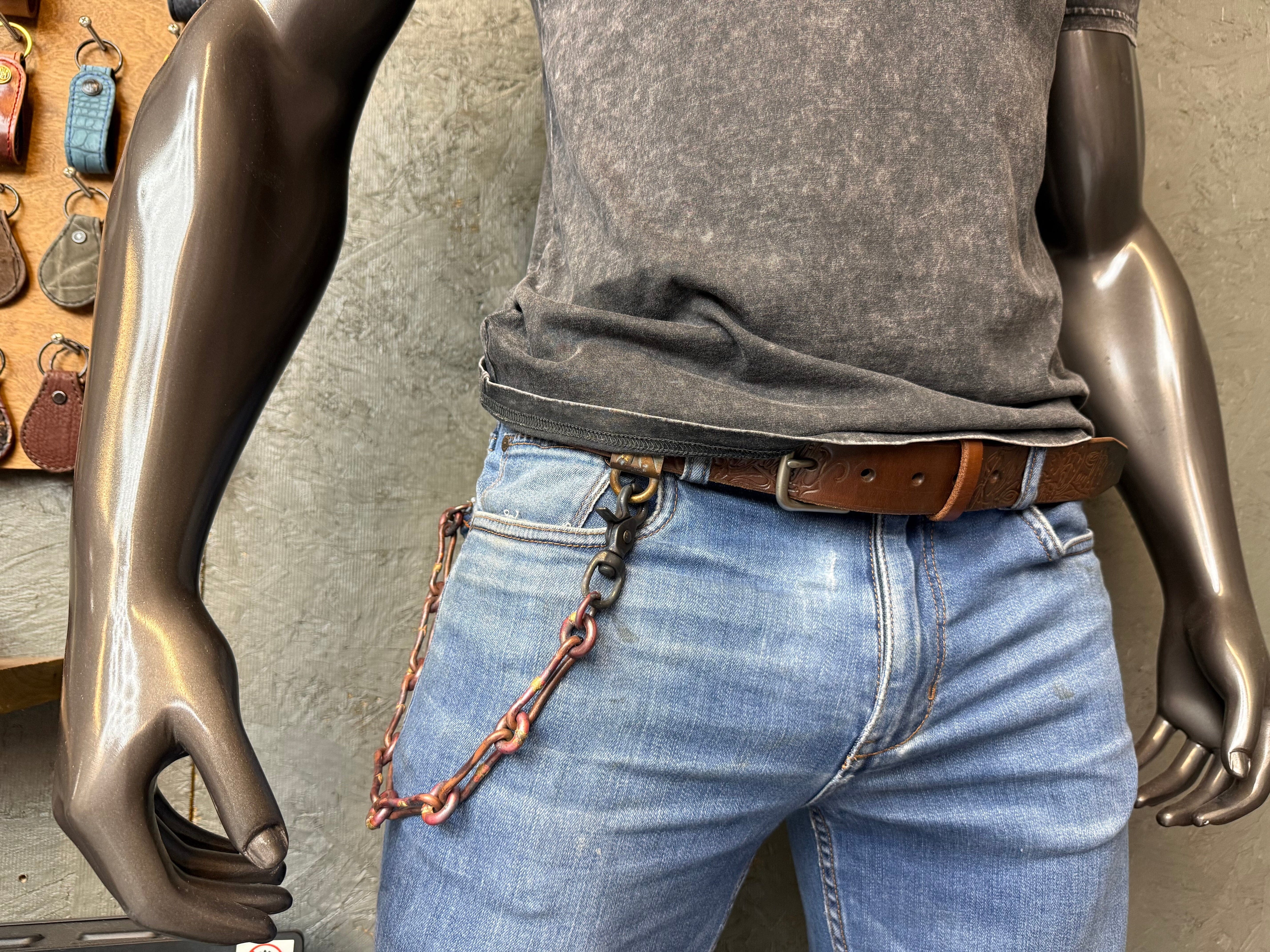 Each link of this 16” wallet chain is hand forged 9999 COPPER & spun on a wood dowel by RTANVIL. They feature a unique “Zombiefied” forced patina (using old school ‘heat hydrogen & oxygen’ patina method) - Blackened Brass Clasps on each end