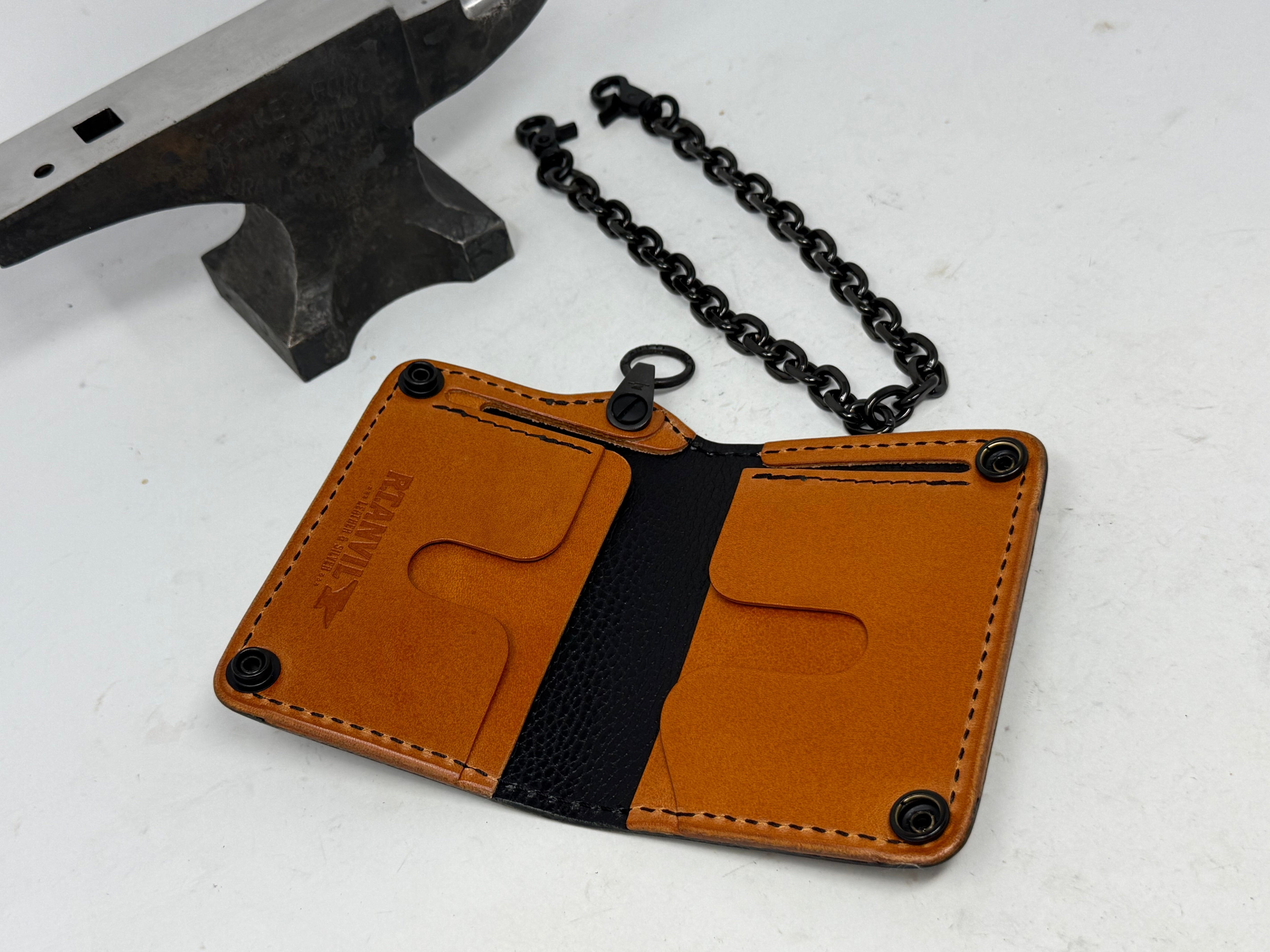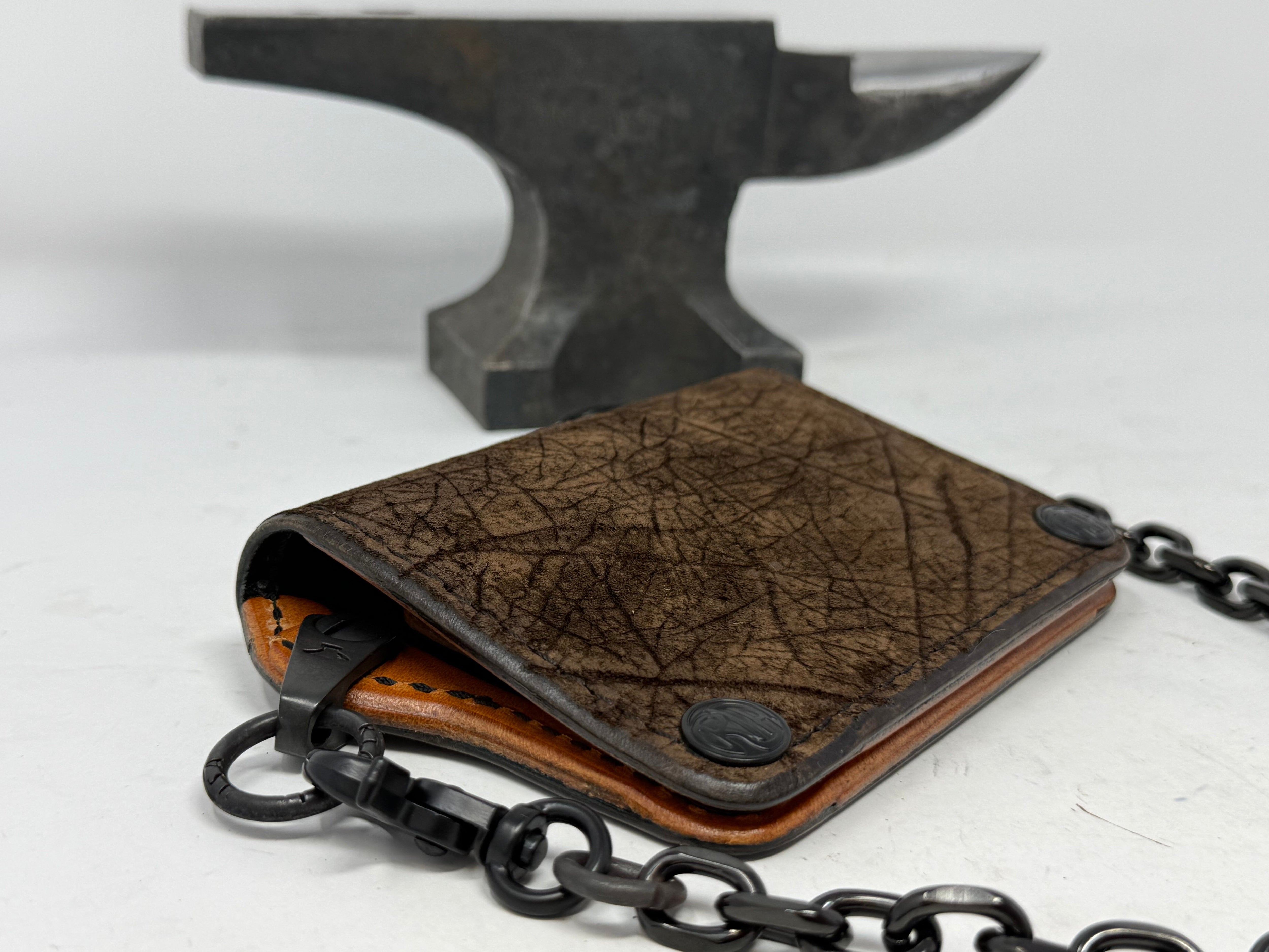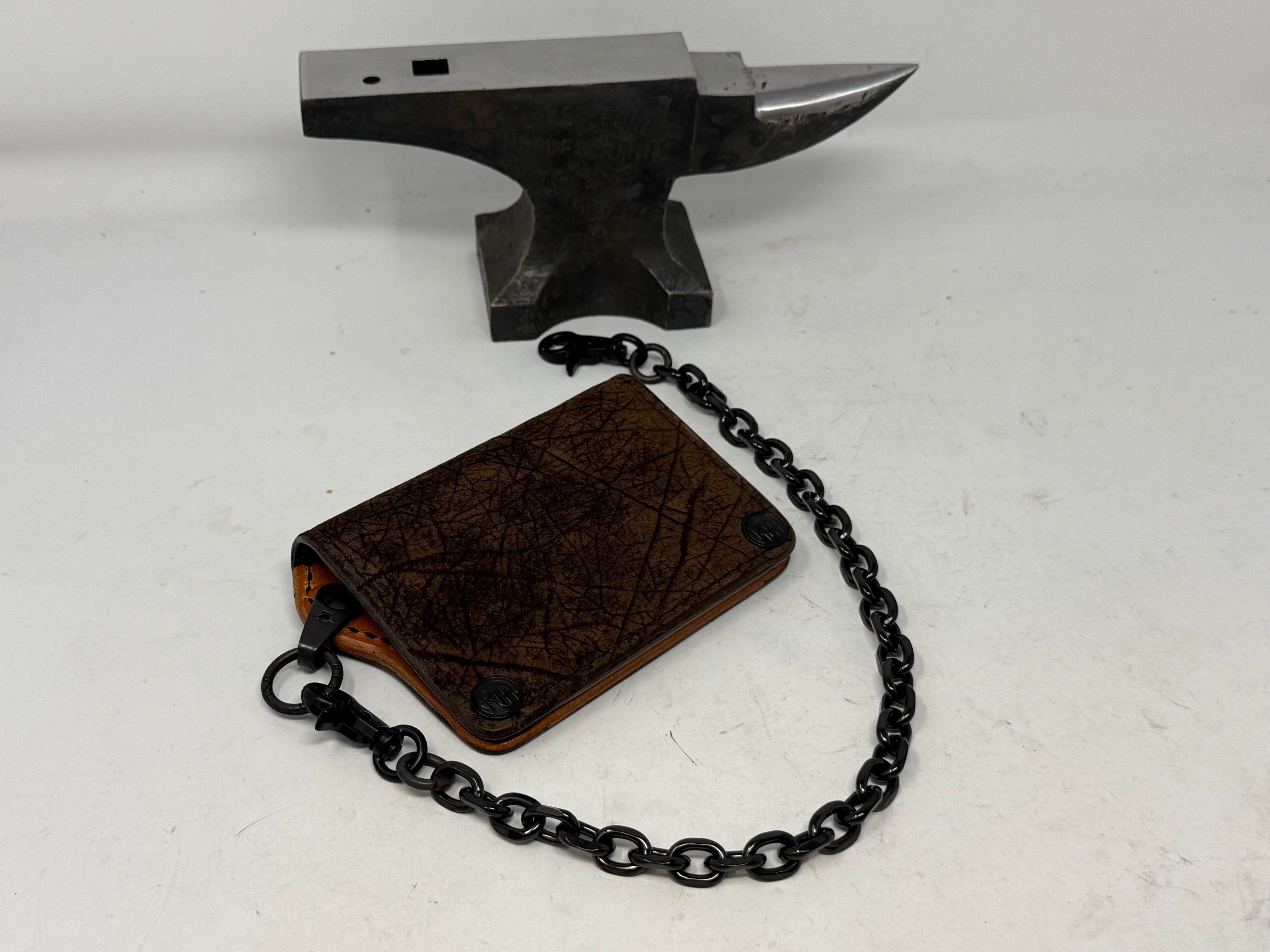 Hand cast brass Anvil Chain Attachment (registered trademark) that offers a 360 degree rotation where the wallet chain connects to the wallet. Swivels side to side & the solid welded ring allows for full rotation. Marked “RTANVIL USA”