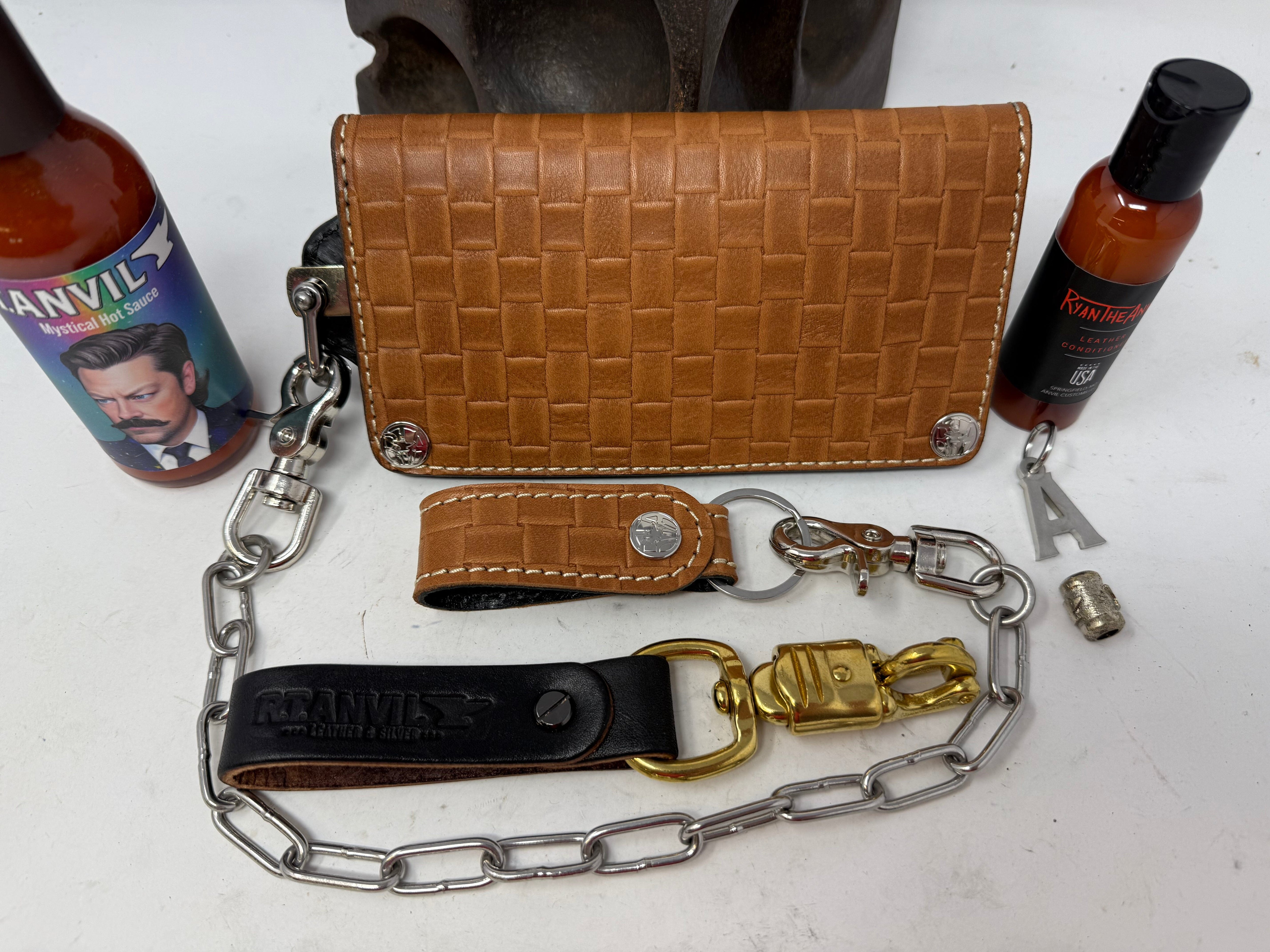 🚨 You get all 9 pieces: Long wallet, wallet chain, matching loop, Brown & Brass Wallet Hanger, Anvil Barrel Bead, “A” Tag, RTAnvil Hot Sauce, RTA Leather Conditioner & Custom BIC Lighter 🚨