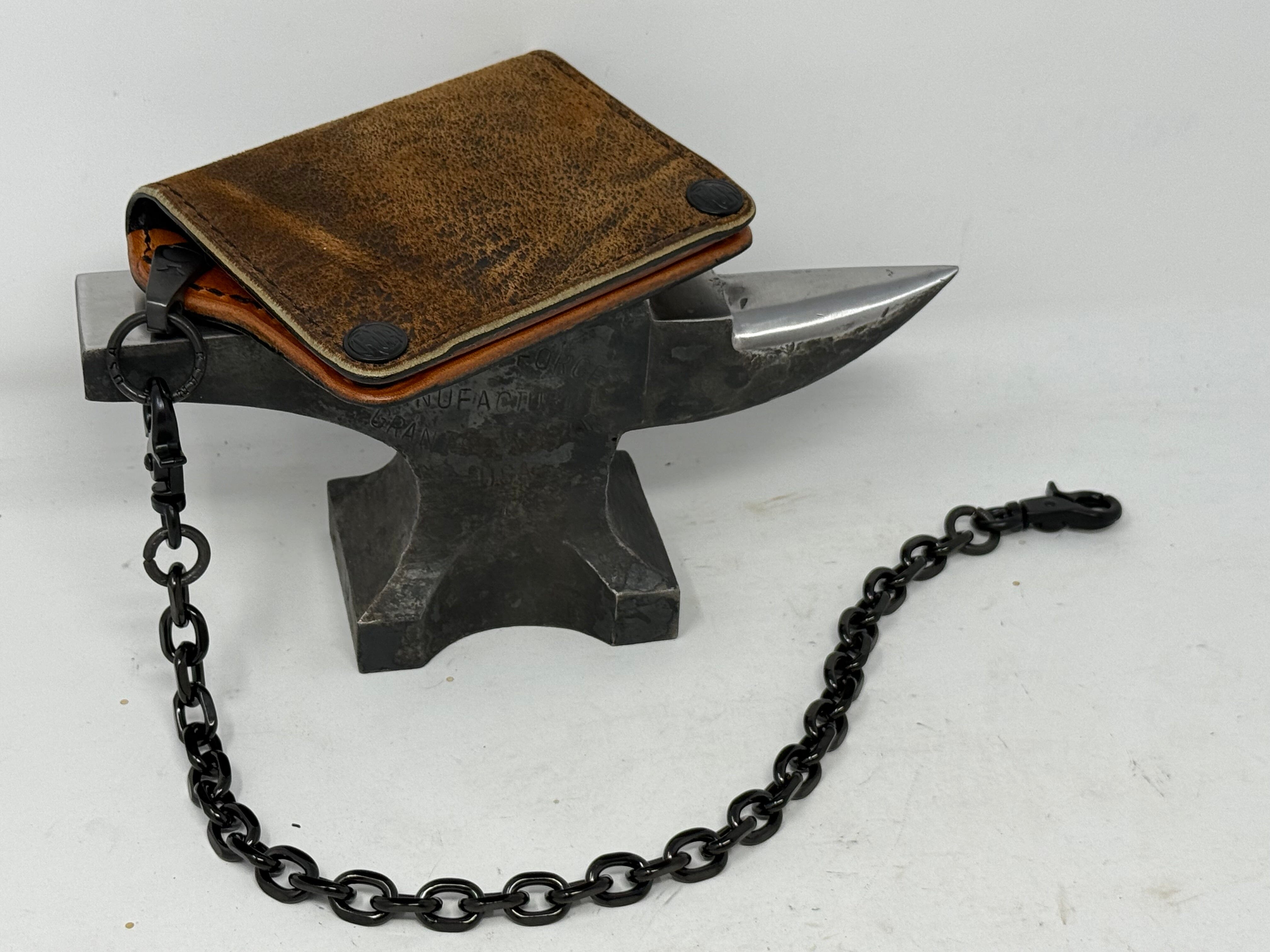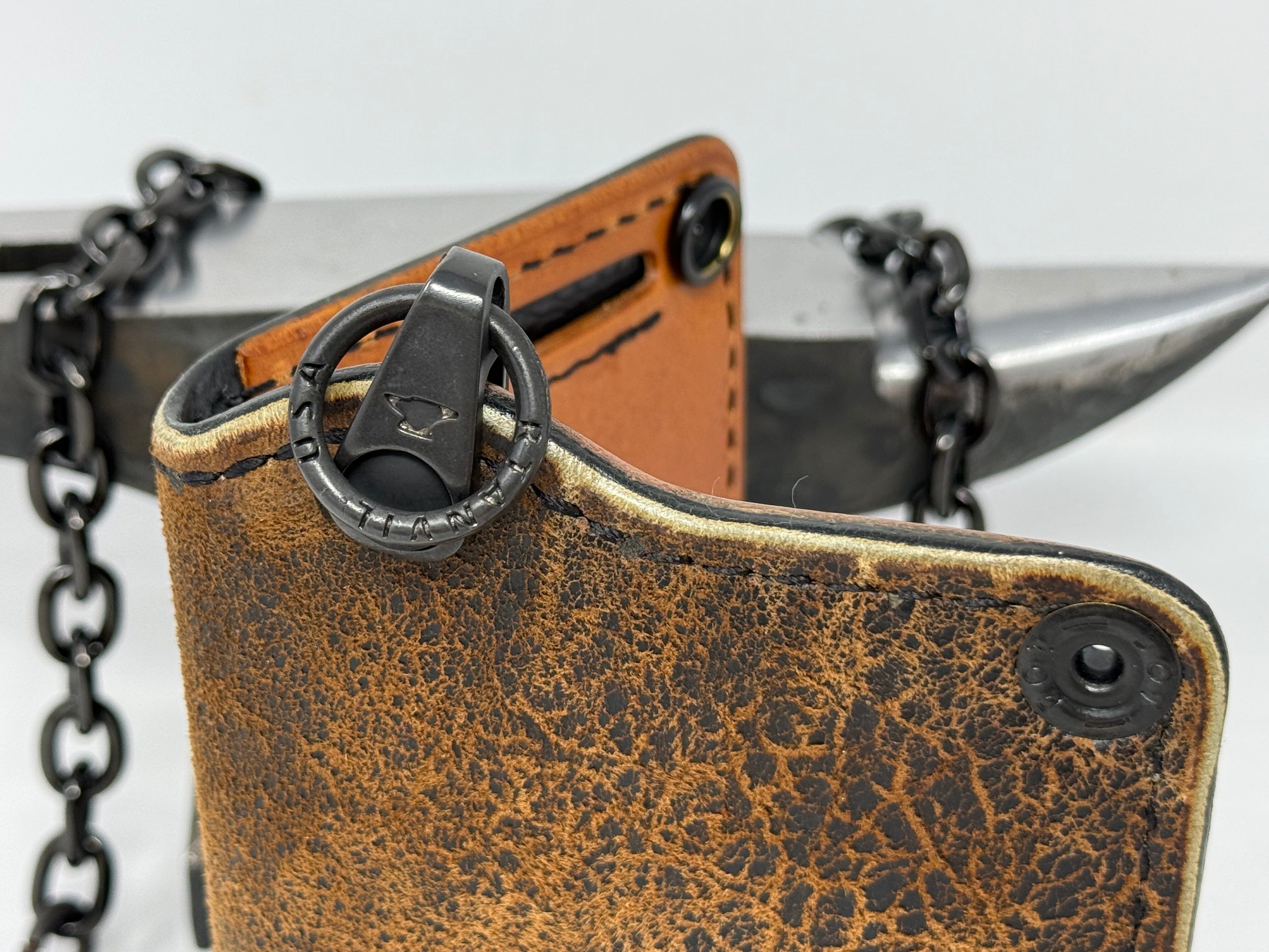 • Hand cast brass Anvil Chain Attachment (registered trademark) that offers a 360 degree rotation where the wallet chain connects to the wallet.  Swivels side to side & the solid welded ring allows for full rotation.  Marked “RTANVIL USA”