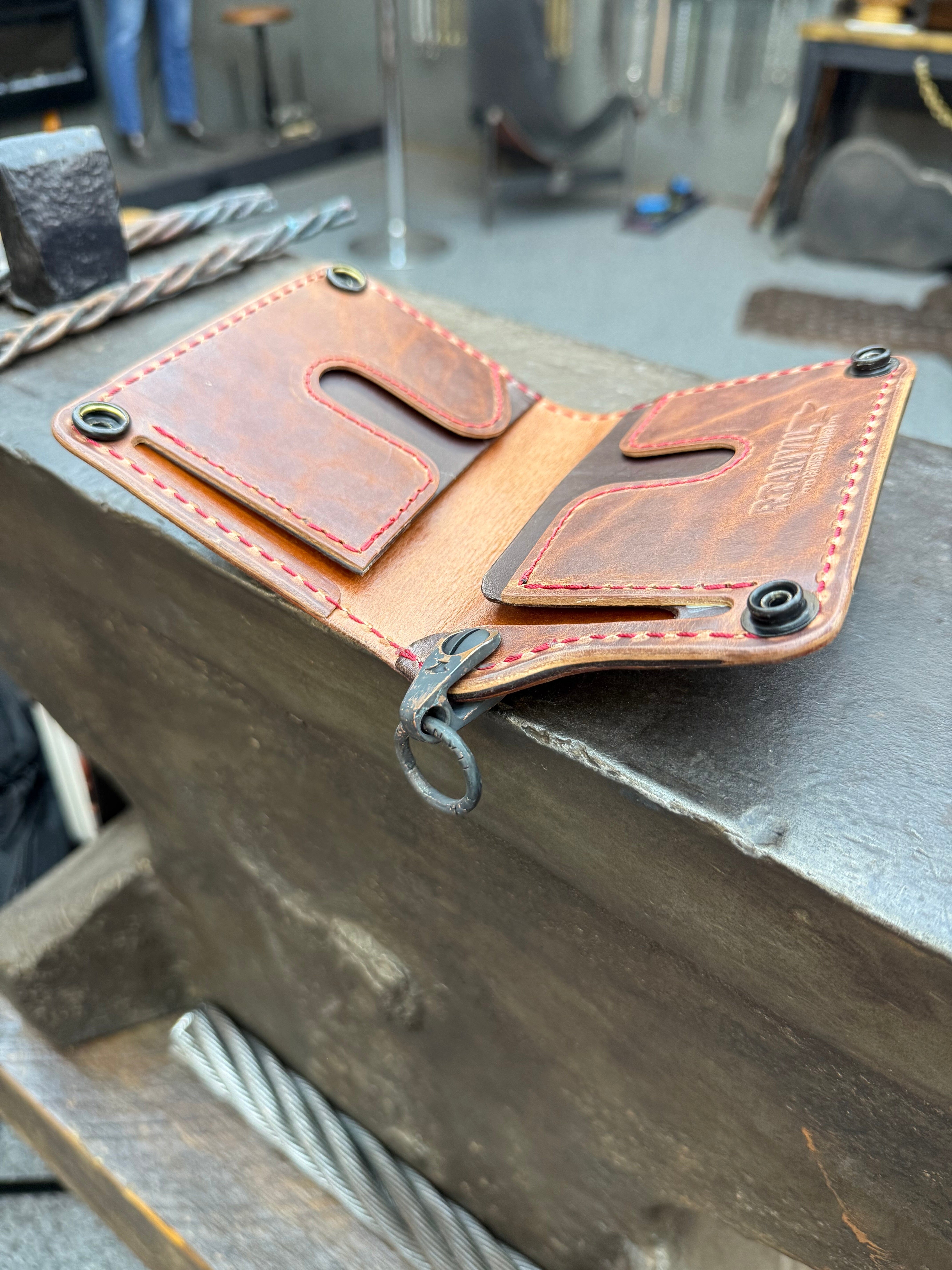 • Hand cast brass Anvil Chain Attachment (registered trademark) that offers a 360 degree rotation where the wallet chain connects to the wallet.  Swivels side to side & the solid welded ring allows for full rotation.  Marked “RTANVIL USA”