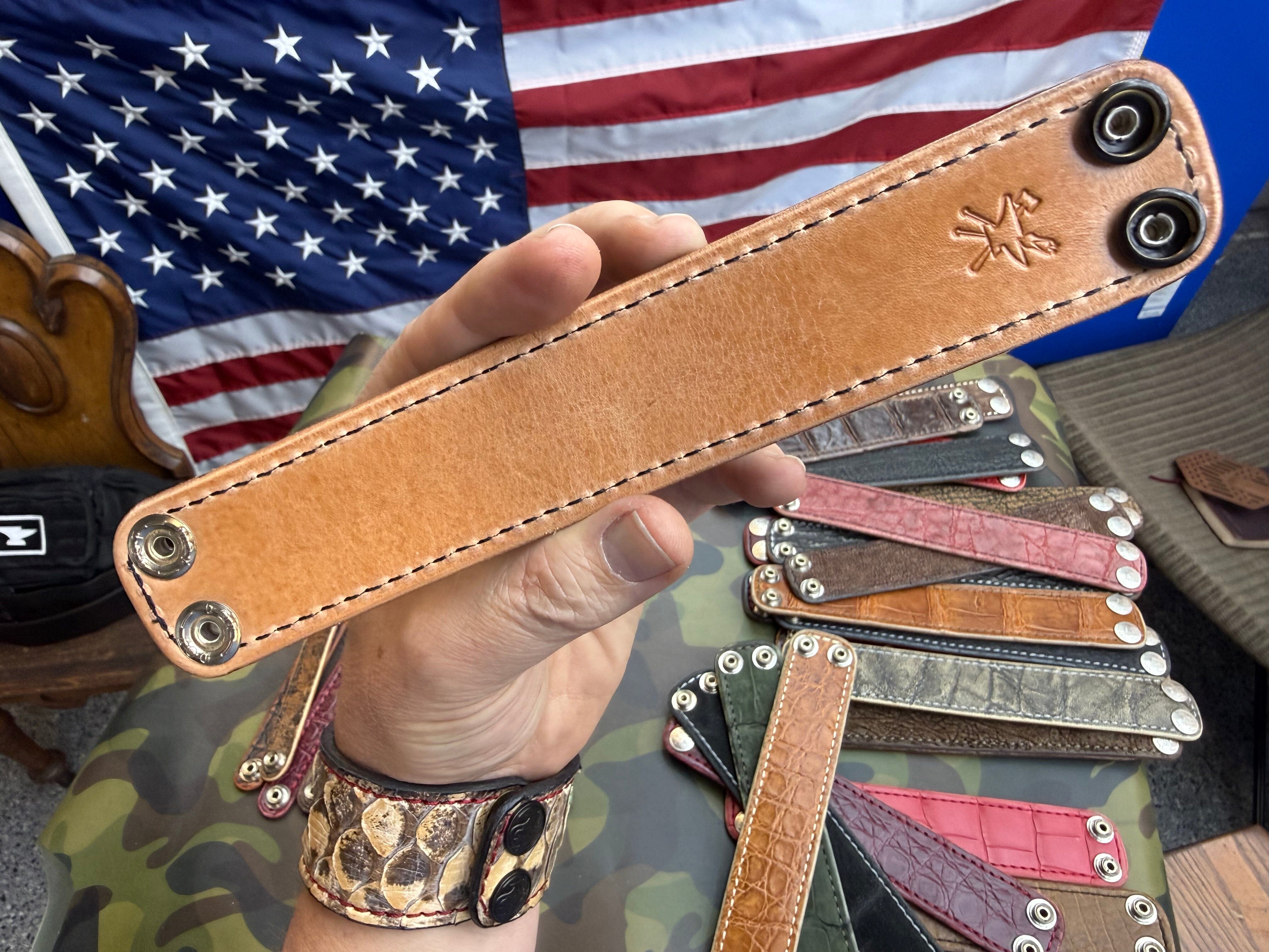 I make ALL my cuffs from exotic hides leftover from Wallet Production — Therefore, Only this ONE QUANTITY is available (sizing is measured between the Snap Centers >> This means your new Anvil Cuff is usually ONE-OFF and unique in its own right!