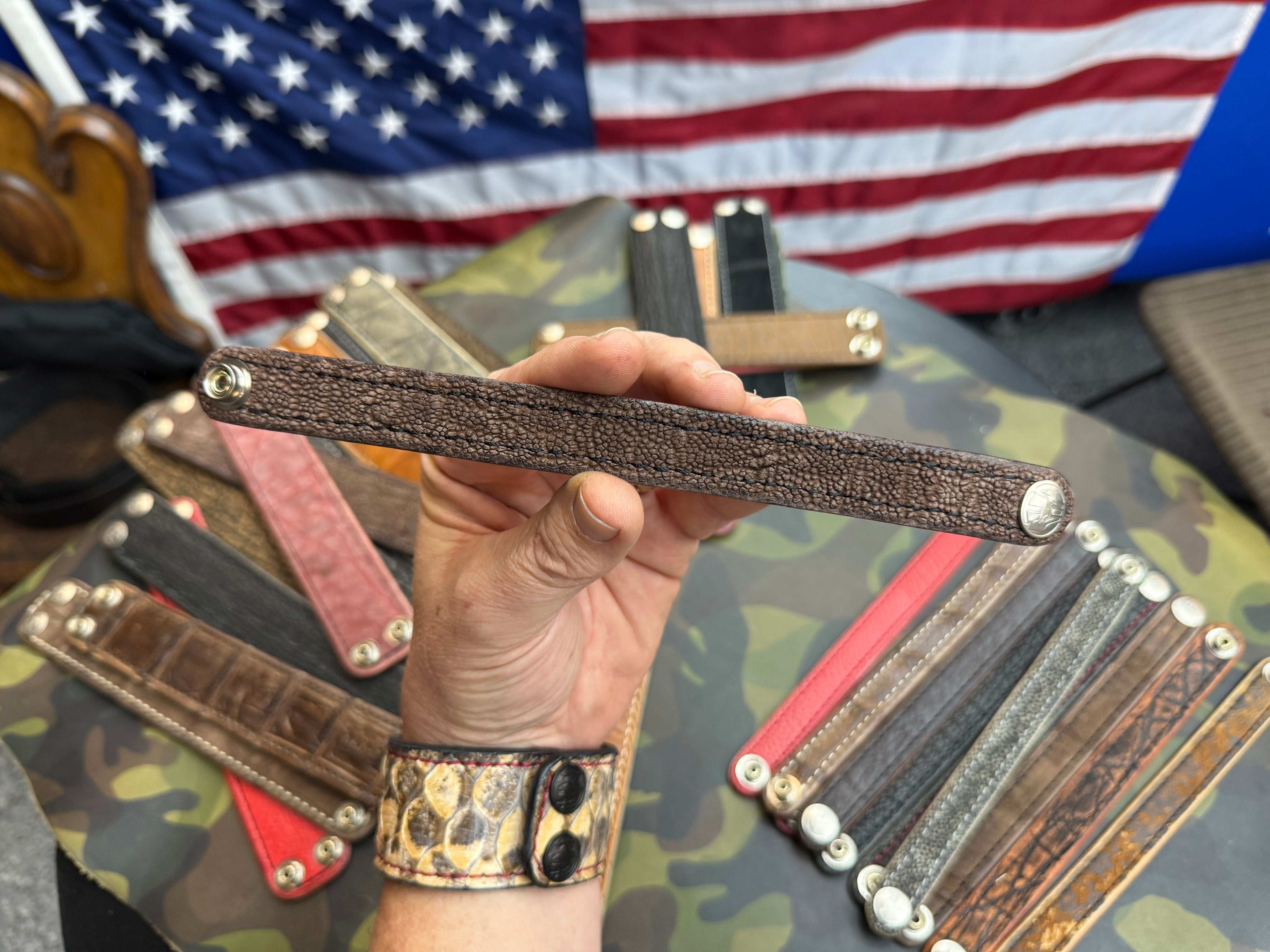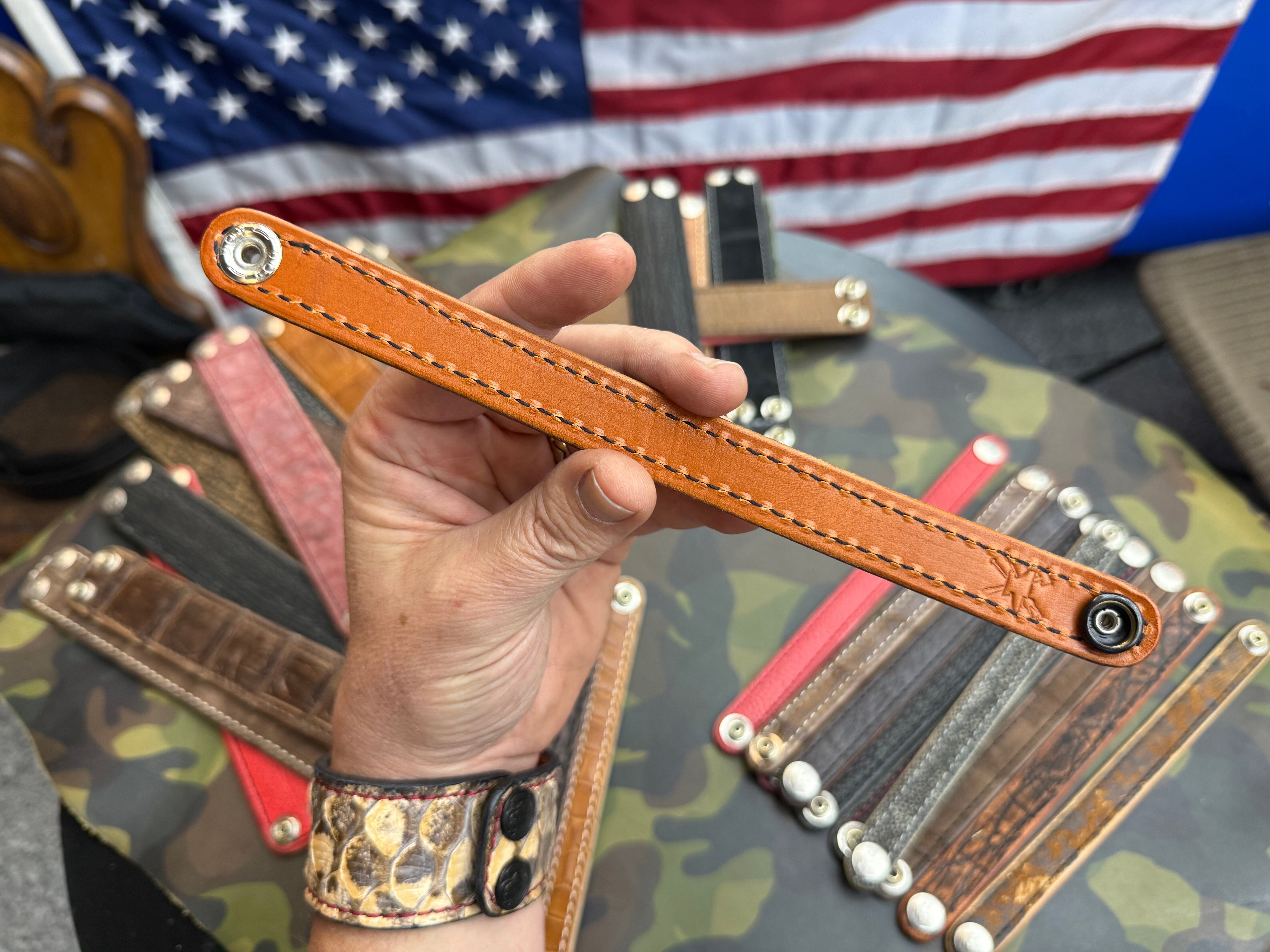 I make ALL my cuffs from exotic hides leftover from Wallet Production — Therefore, Only this ONE QUANTITY is available (sizing is measured between the Snap Centers >>  This means your new Anvil Cuff is usually ONE-OFF and unique in its own right!