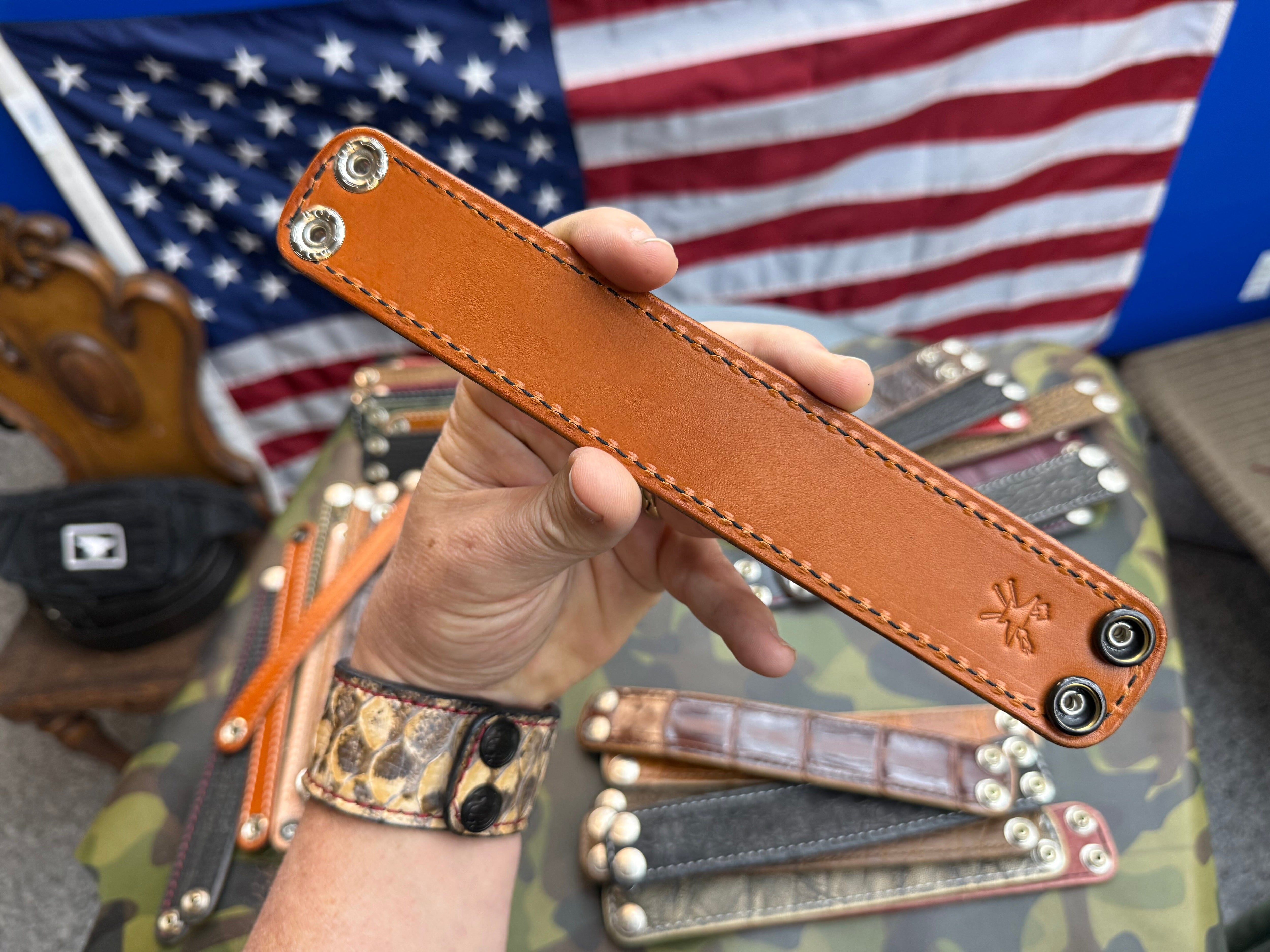 I make ALL my cuffs from exotic hides leftover from Wallet Production — Therefore, Only this ONE QUANTITY is available (sizing is measured between the Snap Centers >>  This means your new Anvil Cuff is usually ONE-OFF and unique in its own right!