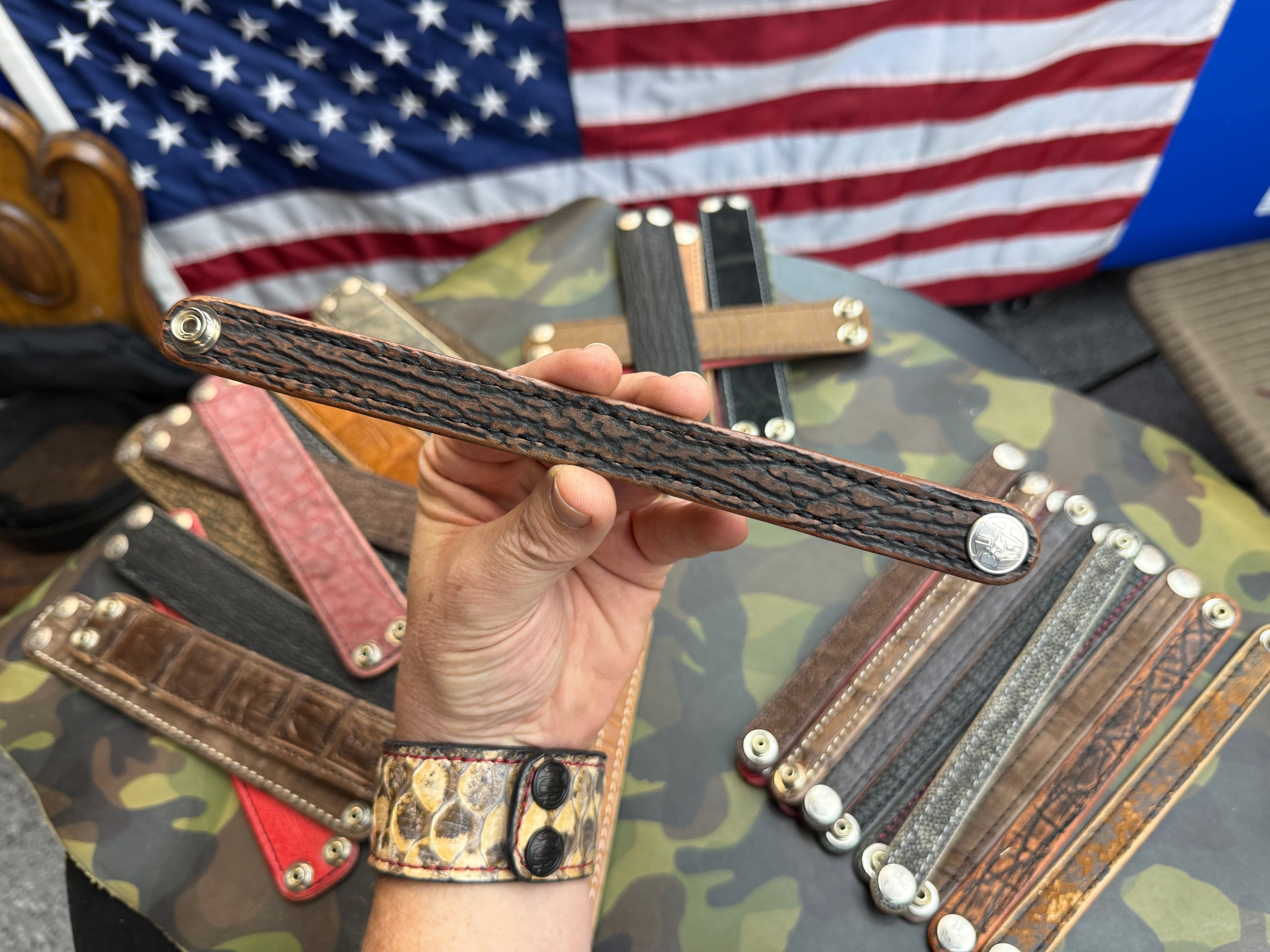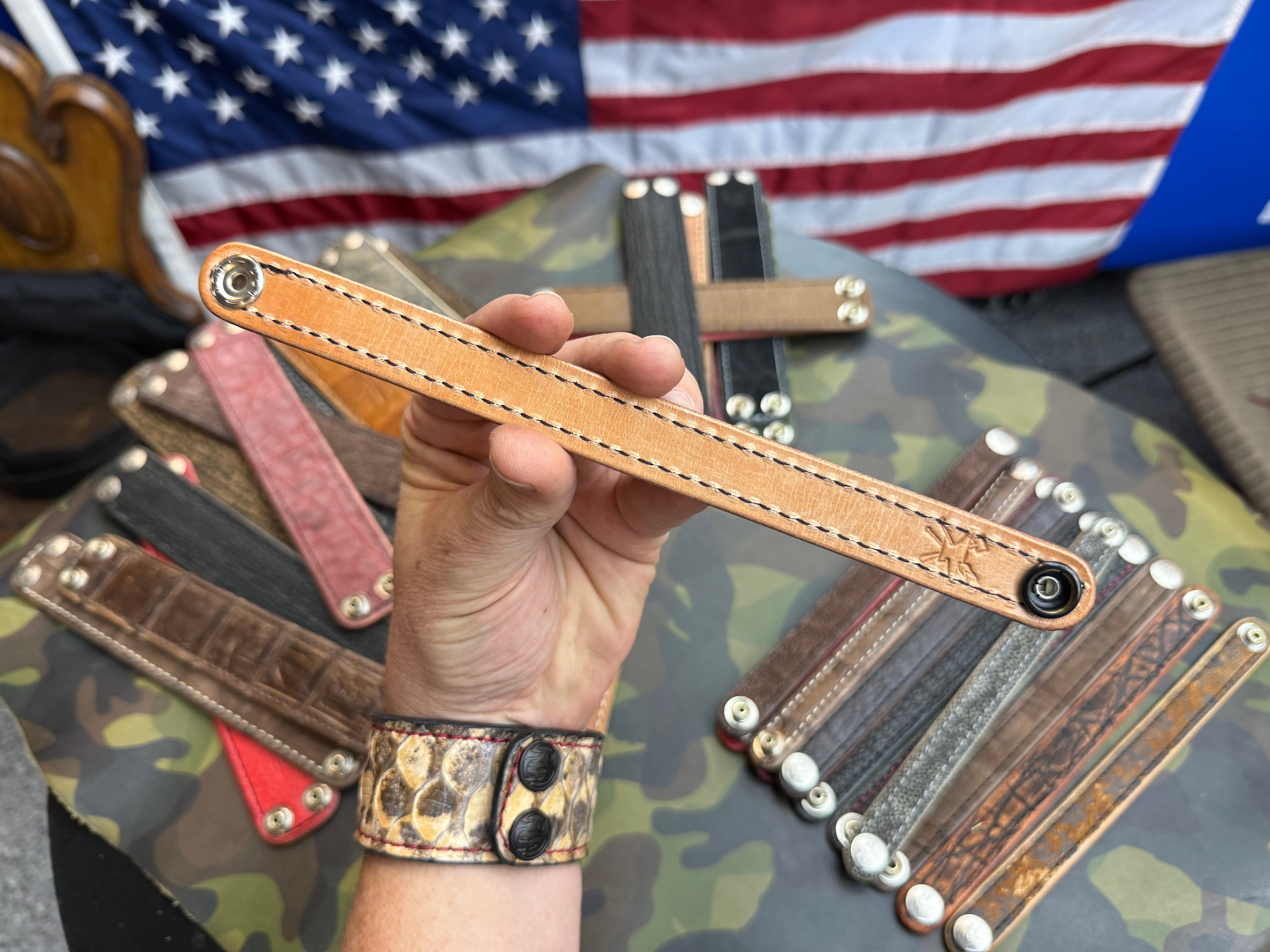 I make ALL my cuffs from exotic hides leftover from Wallet Production — Therefore, Only this ONE QUANTITY is available (sizing is measured between the Snap Centers >>  This means your new Anvil Cuff is usually ONE-OFF and unique in its own right!