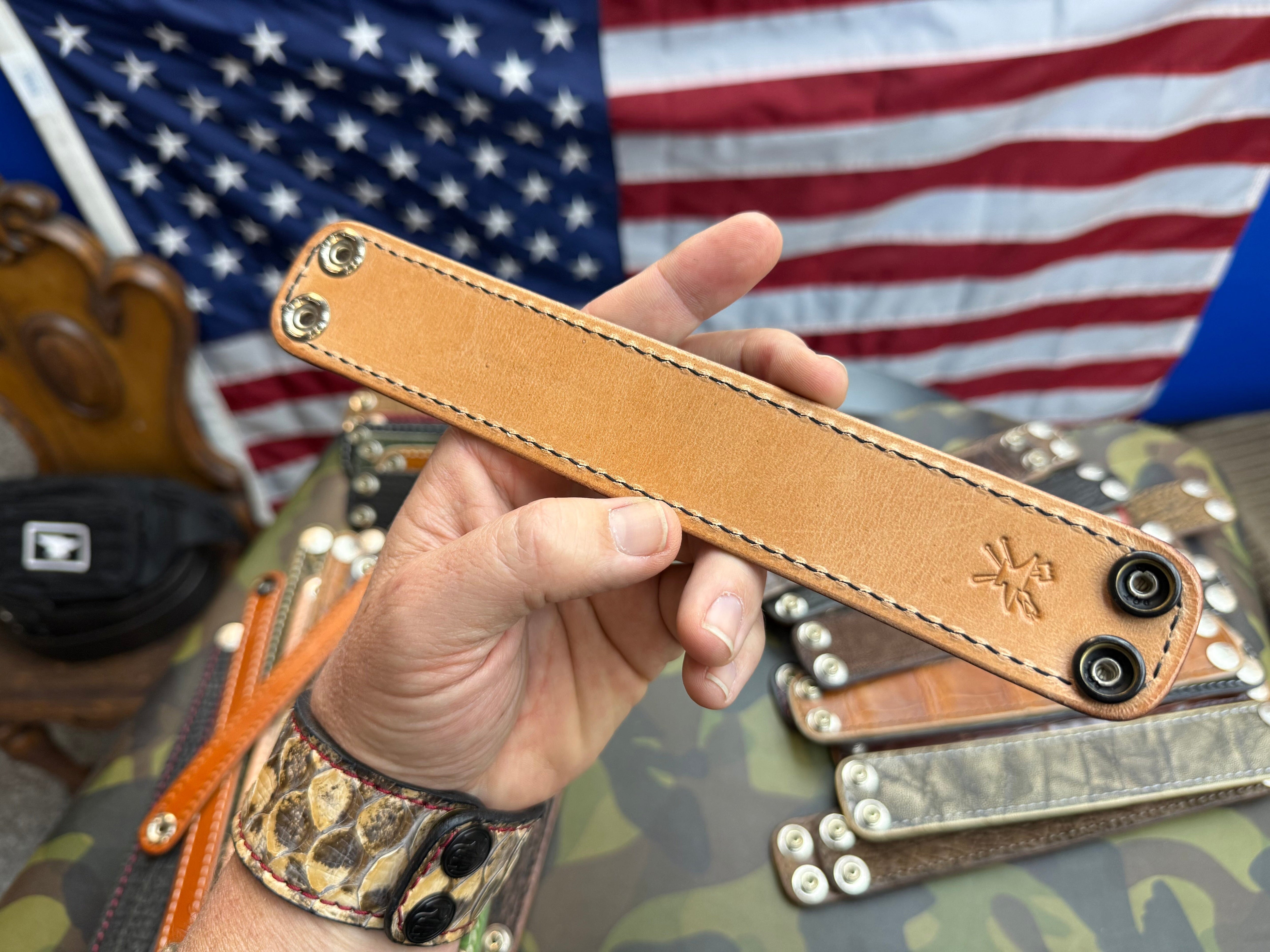 I make ALL my cuffs from exotic hides leftover from Wallet Production — Therefore, Only this ONE QUANTITY is available (sizing is measured between the Snap Centers >>  This means your new Anvil Cuff is usually ONE-OFF and unique in its own right!