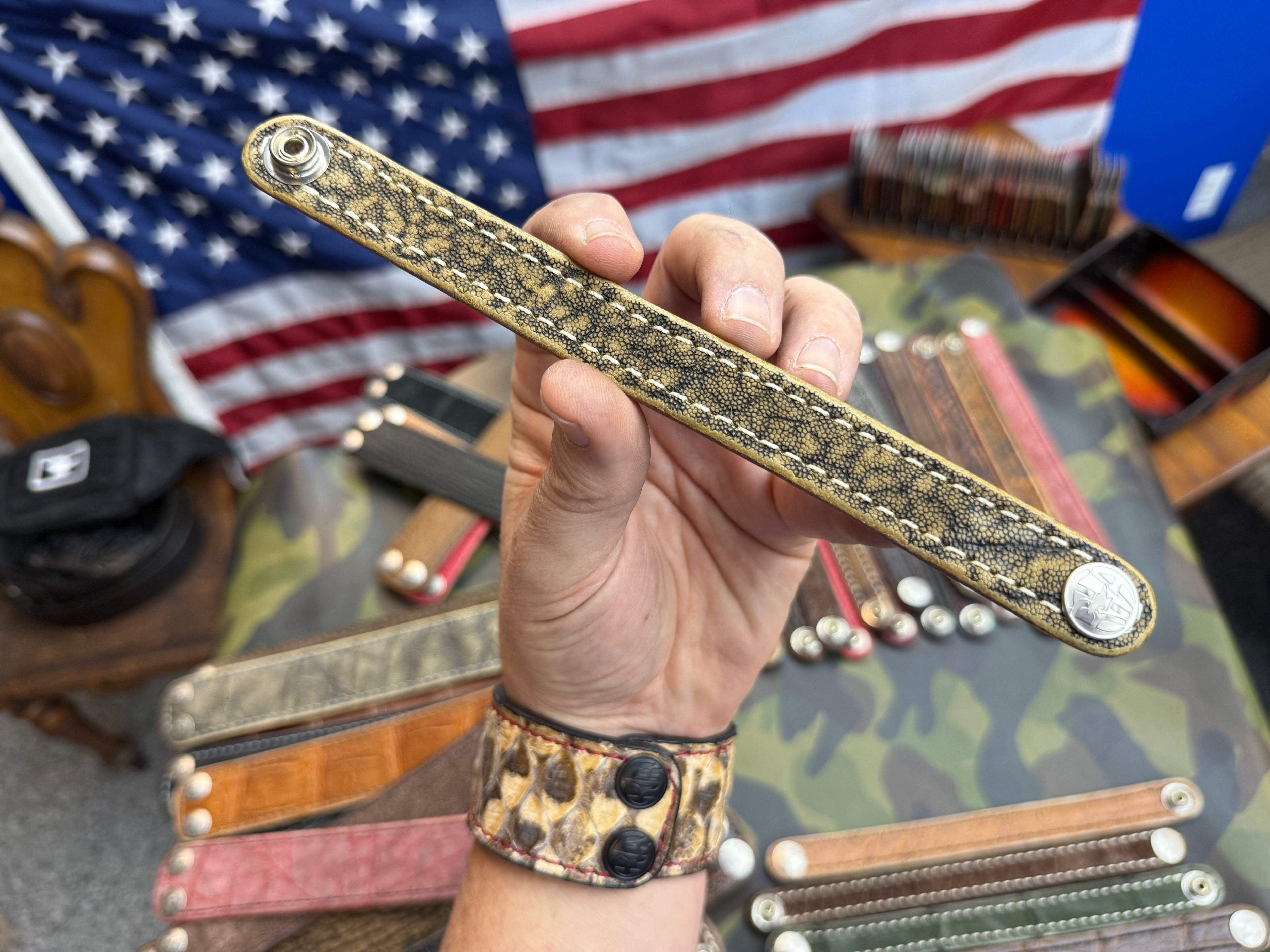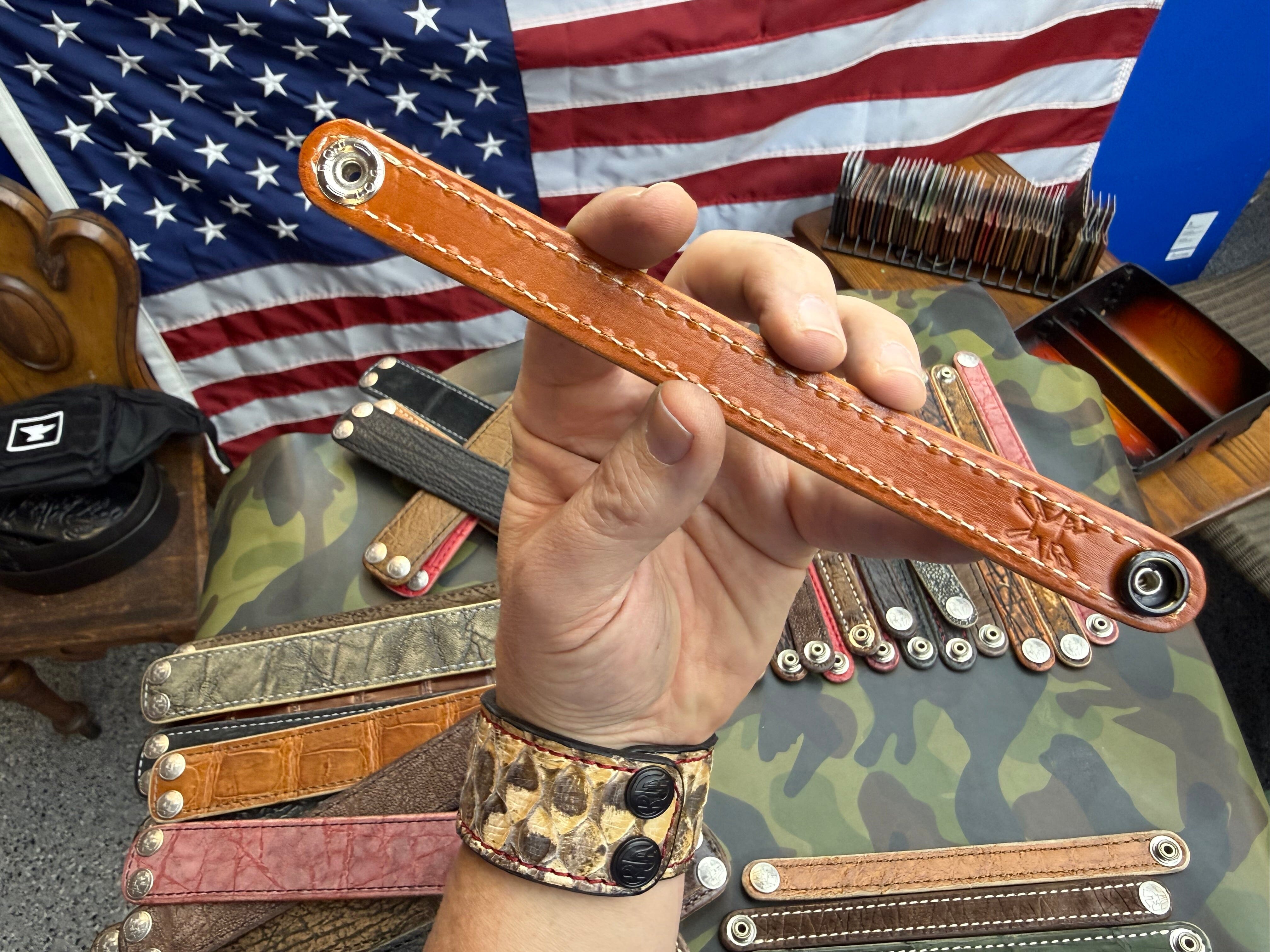 I make ALL my cuffs from exotic hides leftover from Wallet Production — Therefore, Only this ONE QUANTITY is available (sizing is measured between the Snap Centers >> This means your new Anvil Cuff is usually ONE-OFF and unique in its own right!