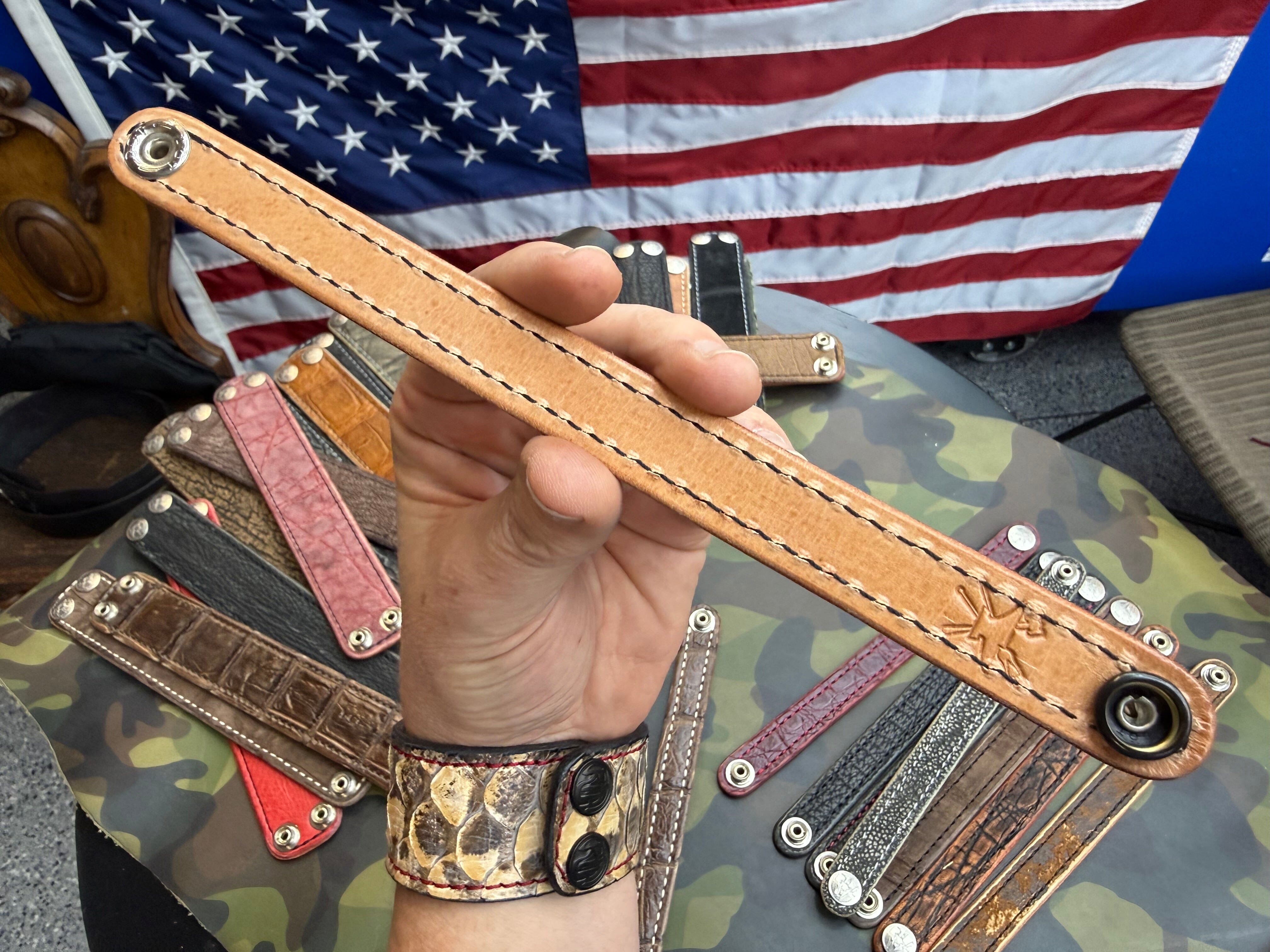 I make ALL my cuffs from exotic hides leftover from Wallet Production — Therefore, Only this ONE QUANTITY is available (sizing is measured between the Snap Centers >> This means your new Anvil Cuff is usually ONE-OFF and unique in its own right!